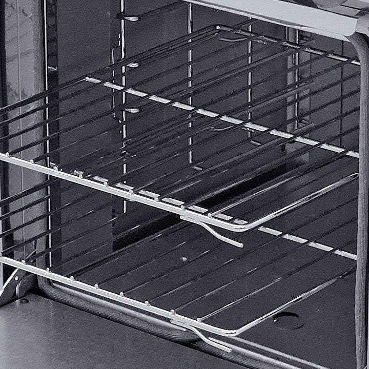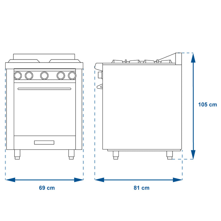 - Horno de 47 x 59 x 42 cm, puertas con bisagras y empaque perimetral para cierre hermético y 2 parrillas niqueladas.