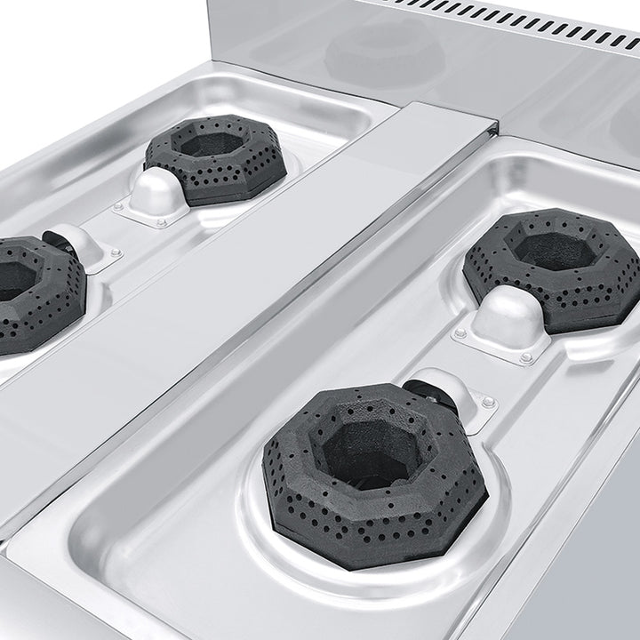 - Quemadores abiertos octagonales con tapa desmontable en hierro fundido a 30,000 BTU/hr cada uno.