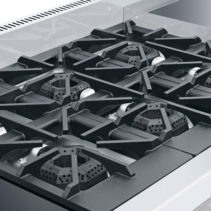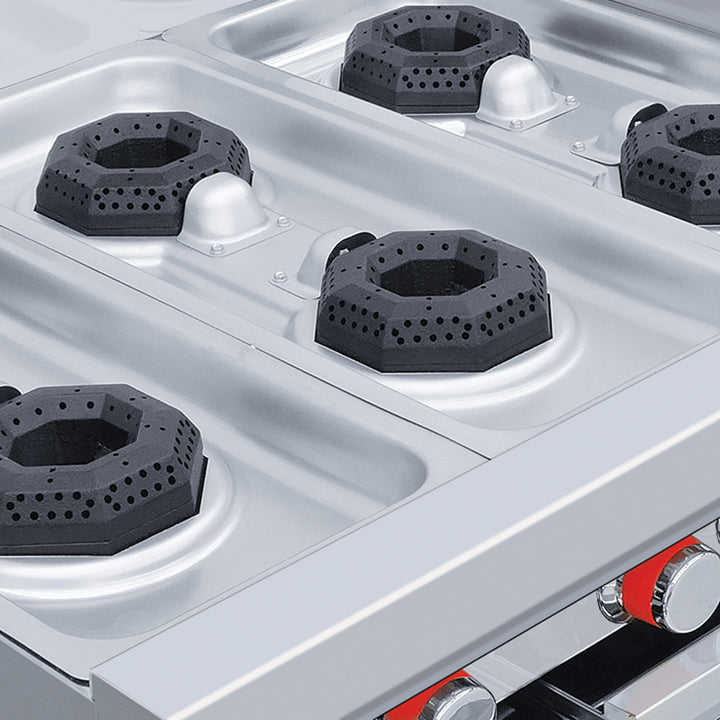 - 6 Quemadores abiertos octagonales con tapa desmontable en hierro fundido de 30,000 B.T.U./h cada uno.
