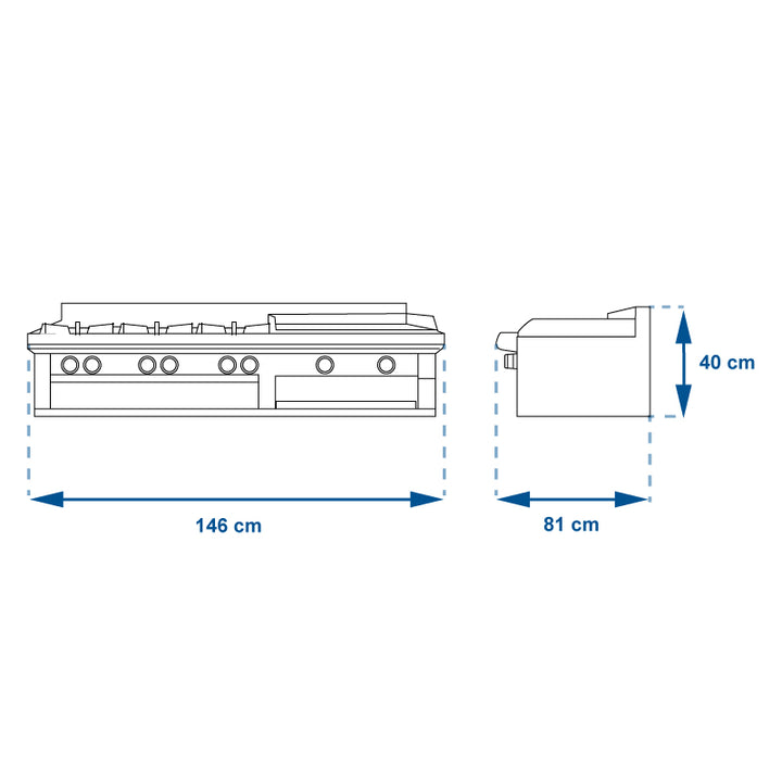 - Gratinador de 43.5 cm de frente con parrilla niquelada.