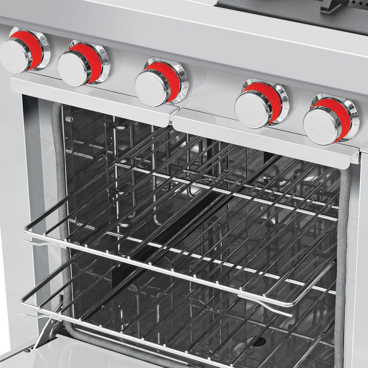 - Horno mediano de 47 x 59 x 42 cm, puerta con bisagras y empaque perimetral para cierre hermético y 2 parrillas niqueladas dentro.