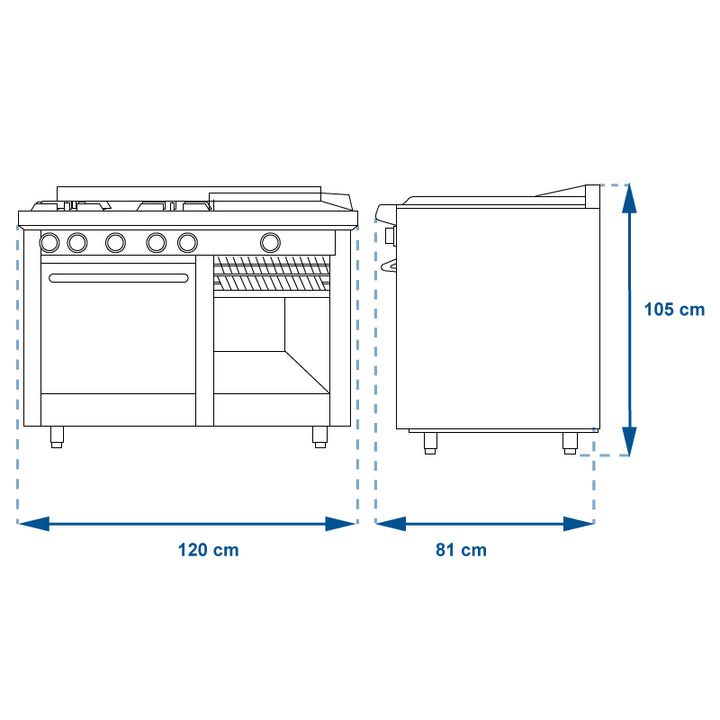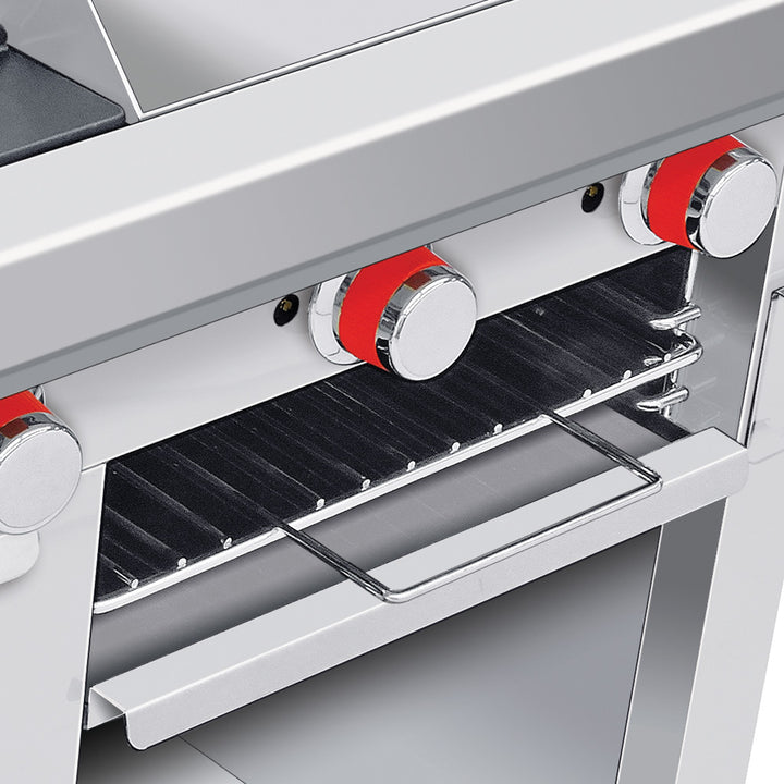 - Gratinador de 43.5 cm con parrilla niquelada y charola para capta}r escurrimientos.
