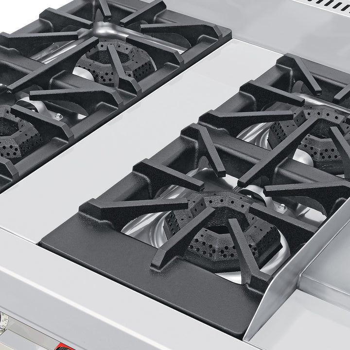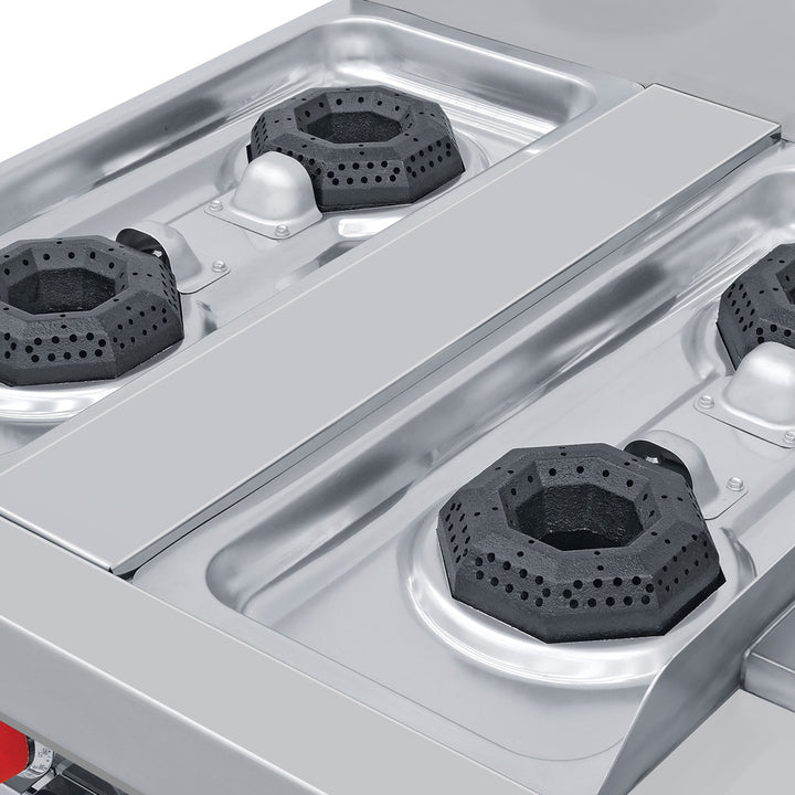 - 4 quemadores abiertos octagonales con tapa desmontable en hierro fundido (30,000 B.T.U./hr cada uno).