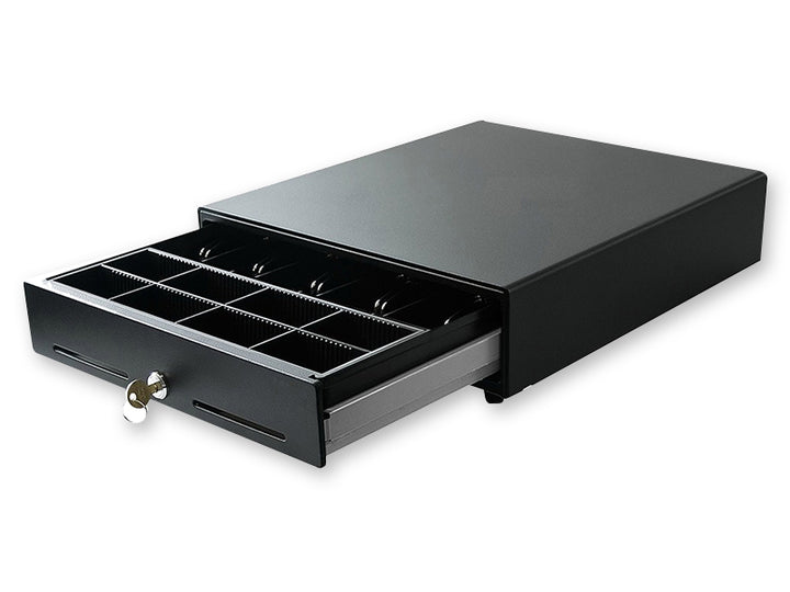 - Cajón de dinero metálico, color negro.